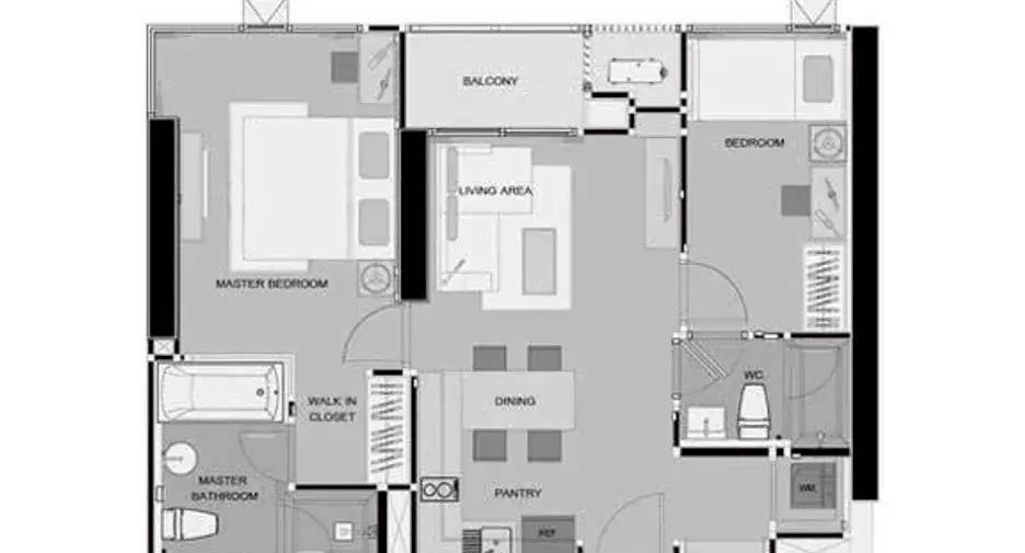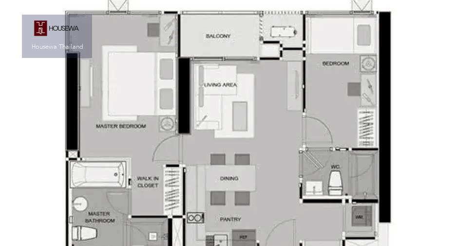 ภายในห้องออกแบบให้ใช้พื้นที่ได้คุ้มค่า มีโซน ห้องนั่งเล่นและห้องทานข้าวแบบ Open Plan รับแสงธรรมชาติเต็มที่ด้วยกระจกบานใหญ่แบบเต็มผนัง (Floor-to-ceiling) ทั้งสองห้องนอนจัดฟังก์ชันลงตัว มีพื้นที่เก็บของเพียงพอ ครัวบิวท์อินพร้อมเครื่องใช้ไฟฟ้าครบ เหมาะทั้งทำอาหารง่าย ๆ ทุกวัน หรือรองรับแขกในวันพักผ่อน
