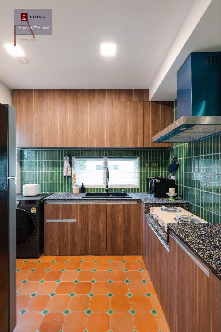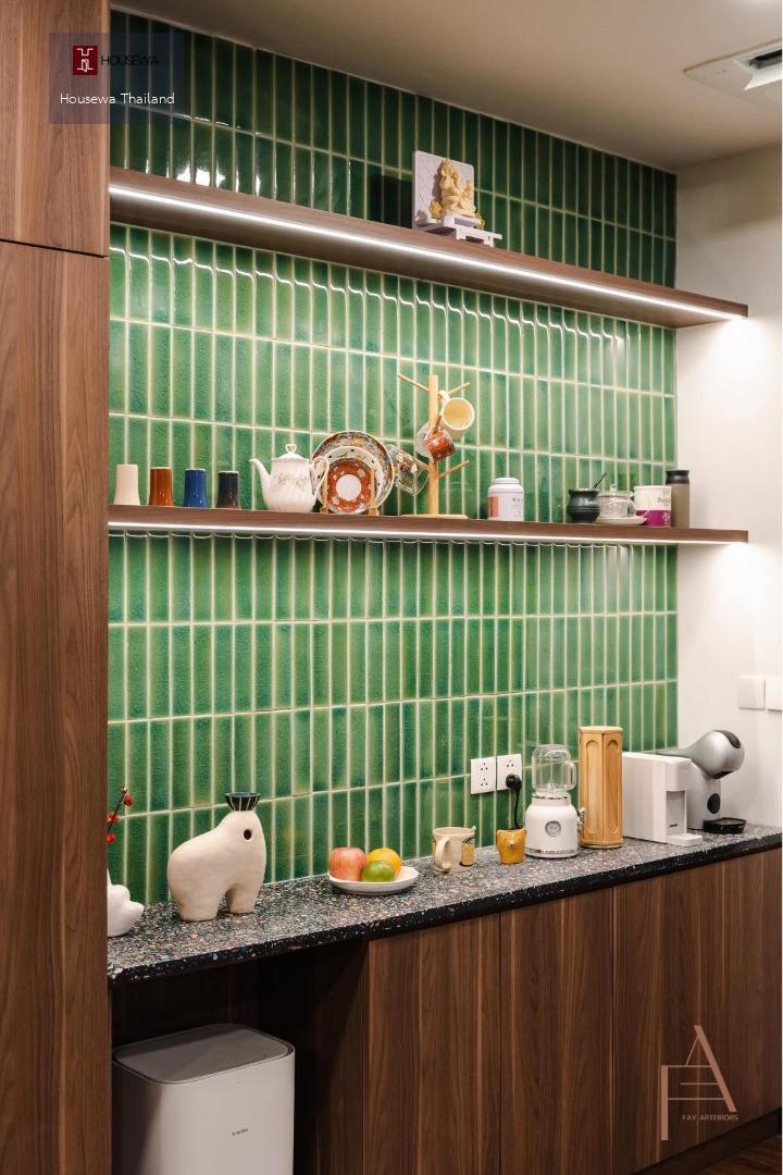 – Vintage Coffee Bar & Dining: มุมทานข้าว/คอฟฟี่บาร์ ผนังกระเบื้องเขียววินเทจ (Green Subway Tiles) + ชั้นไม้ Built-in ฟีลคาเฟ่ทุกเช้า